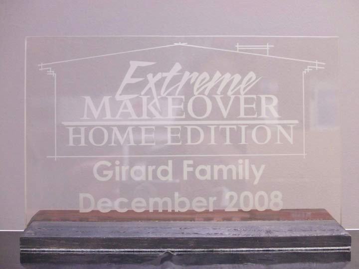 1/4" Clear annealed 8"x12" etched glass plaque with the Extreme Logo & Bare-wood stand.